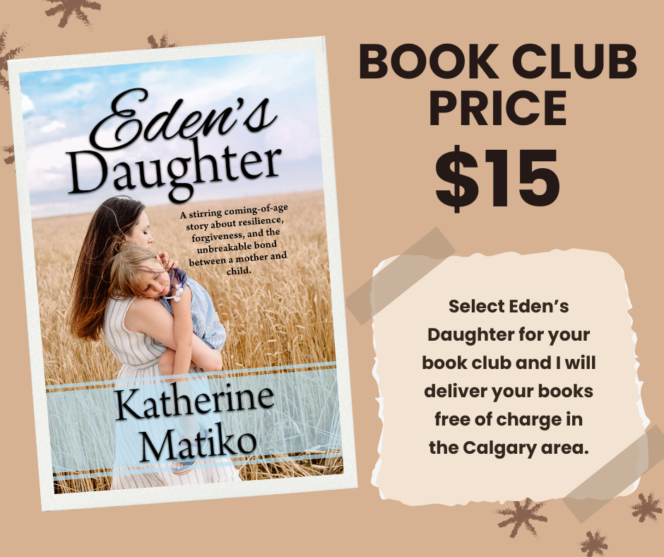 Do you belong to a book club in the Calgary, Alberta area? I am offering a book club special price of $15 for Eden’s Daughter including tax for paperback copies. I am also available to speak to your book club about my novel and the writing process. My presentation features a 70s trivia contest, author reading, and book signing. Please let me know if you are interested!